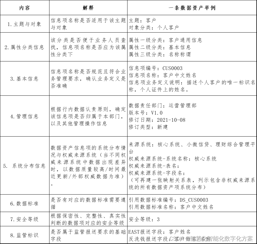以银行一个“客户中文姓名”的基础数据项为例,通过数据资产盘点,我们可以得到关于数据资产的以下方面信息: