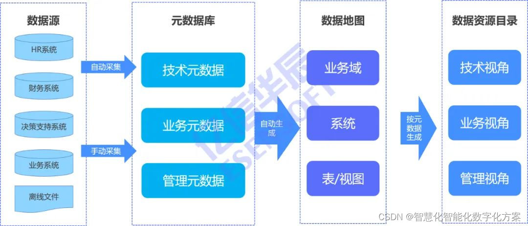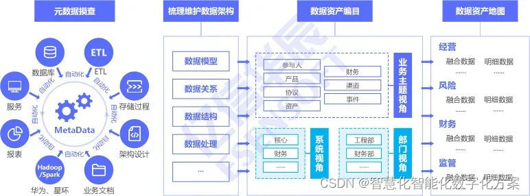 此方案内容包括元数据摸底、元数据维护、数据资产分类框架、数据资产目录构建,方案架构如下:
