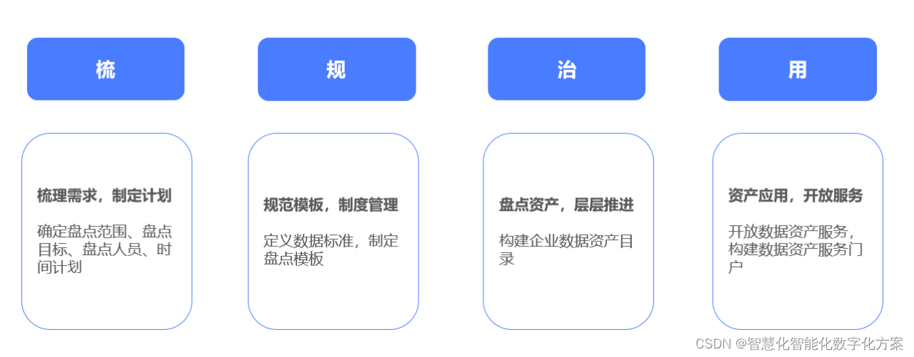 以盘清家底为根基,梳理分类、规范管理、根治问题、持续应用为目标,构建业务系统数据资源目录,发布数据标准,有效推进数据资源共享和应用,数据资产盘点一般可分为“梳、规、盘、用”四大流程。