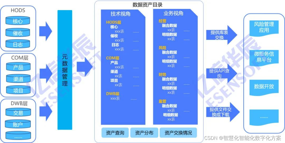 3、盘点资产,层层推进。从业务视角对数据资源进行梳理和规划,从技术视角对系统数据进行盘点,产出数据资产盘点成果物。