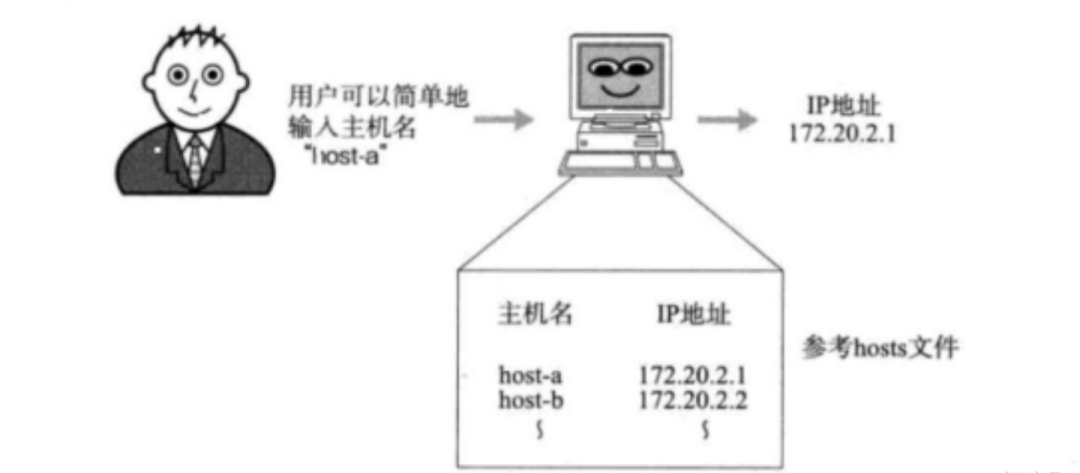 于是人们发明了一种叫主机名的东西,是一个字符串,并且使用hosts文件来描述主机名和IP地址的关系。