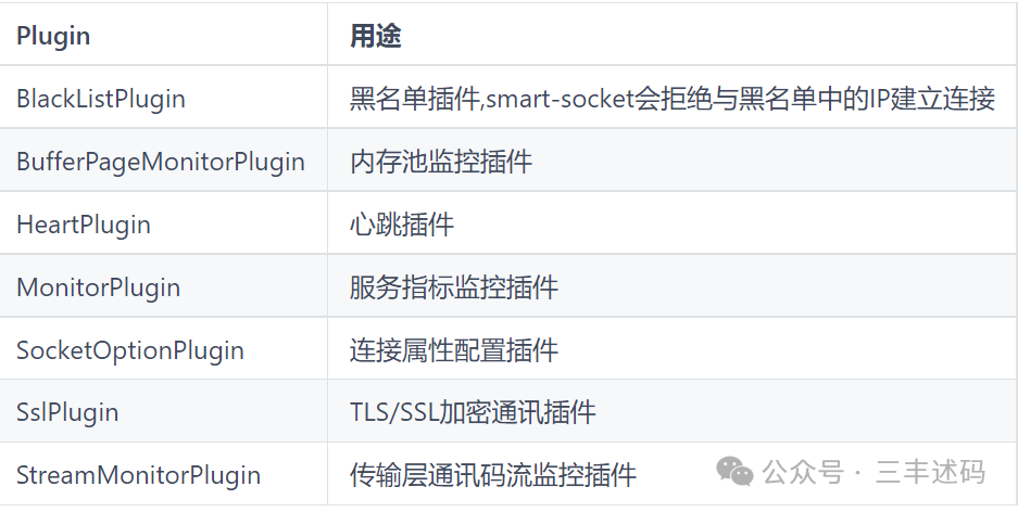 Smart-Socket支持自定义插件,并已提供了丰富的插件,包括SSL/TLS通信插件、心跳插件、断链重连插件、服务指标统计插件、黑名单插件、内存池监测插件等,这些插件可以方便地集成到框架中,以满足不同场景下的需求。