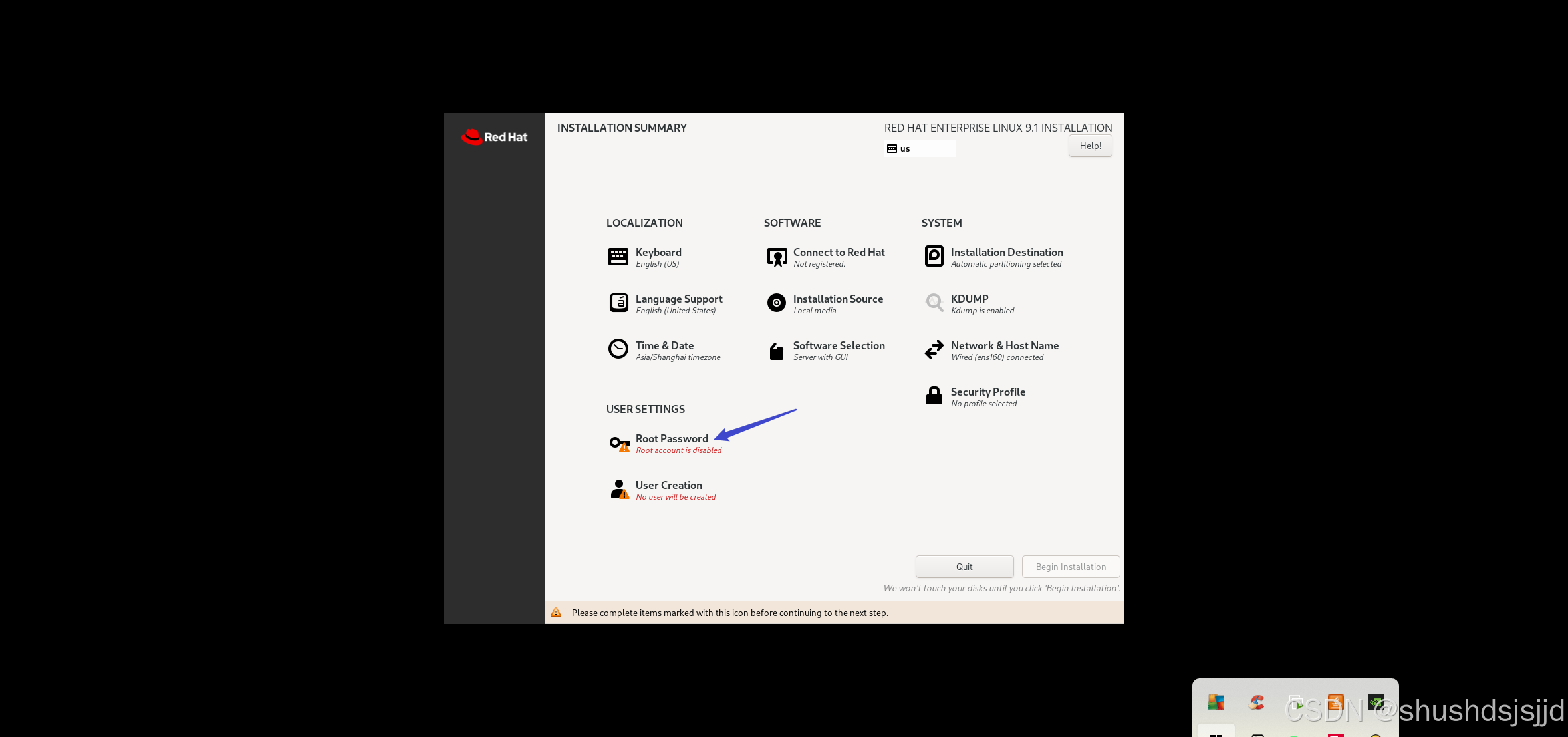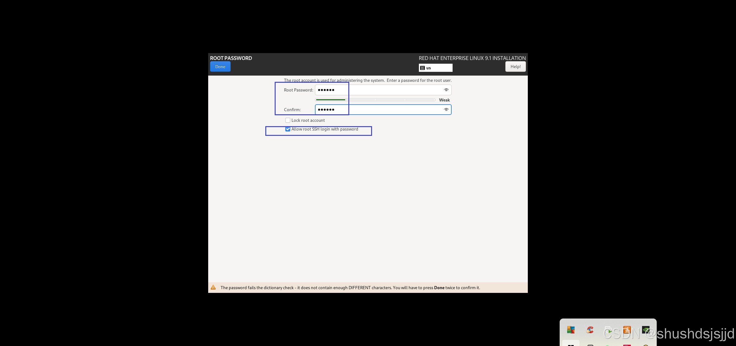 5.安装之前还需要为Root用户设置密码(如果设置的密码为弱密码,则需要点两次确定。)