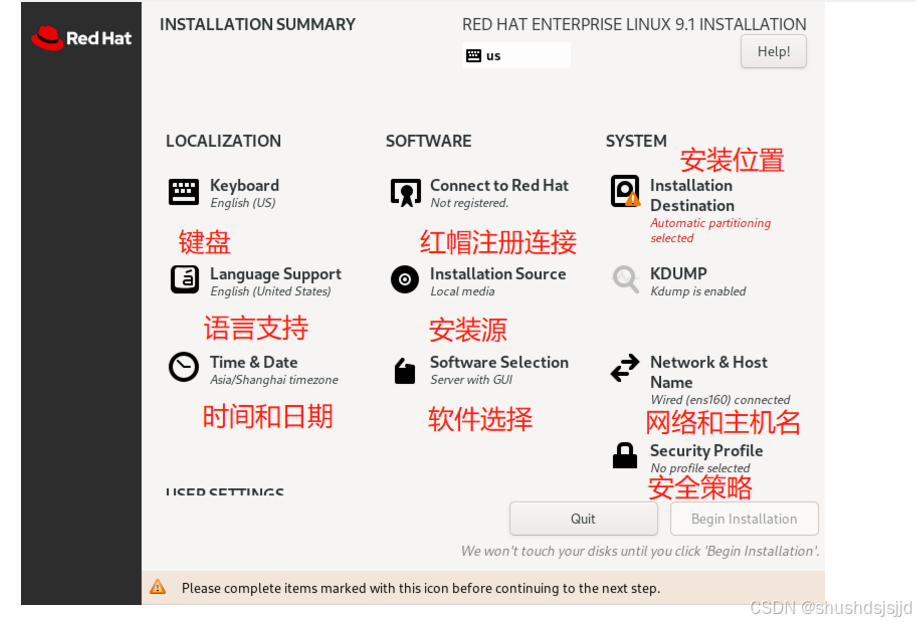 2.图示为每一项的中文意思,KDUMP是一个系统崩溃时收集信息的工具,如果系统用于练习则不需要开启。