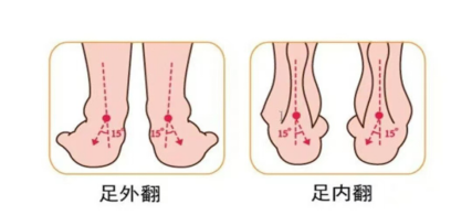 “足外翻”是指脚向外翻转,需依赖足部内侧负重行走。