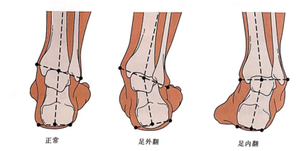 当站立时,从后面观看,距骨和跟骨在同一条直线上,并垂直于地面即为正常姿态。若距骨相对于跟骨向内侧偏,即为足外翻。若距骨相对于跟骨向外侧偏,即为足内翻。