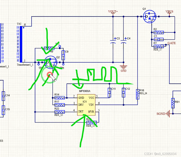 因为同步整流的驱动IC需要有电压启动信号后才会正常工作,正常工作后才有PWM波形输出控制管子导通或者截至,所以这里NMOS管电源输入端这么接,就是让管子的体内二极管让它先导通,才会给这个IC供电,IC启动后才有控制信号出来控制管子的导通或者截至