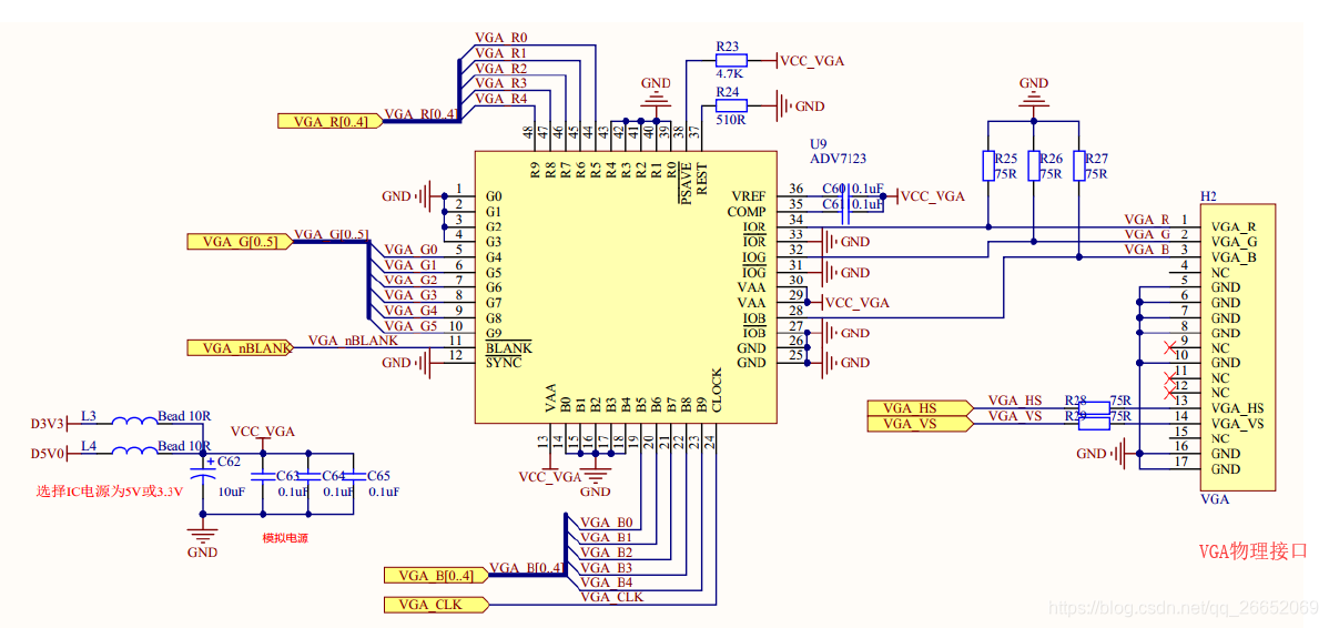 下面这幅同样是ADV7123原理图,看起来更为清晰一点。但是与上面不同的是,这里的VGA显示选择了RGB565模式,R0-4,G0-5,B0-4,这样同样也节省了FPGA的引脚。