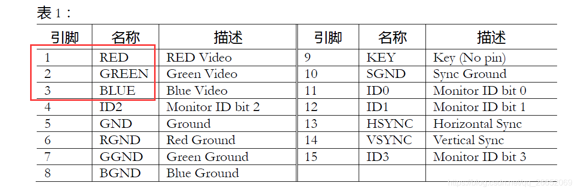 引脚1、2、3分别代表红绿蓝三基色模拟电压,为0~0.714V(peak-peak),0V代表无色,0.714V代表满色。一些非标准显示器使用1Vppd 满色电平。
