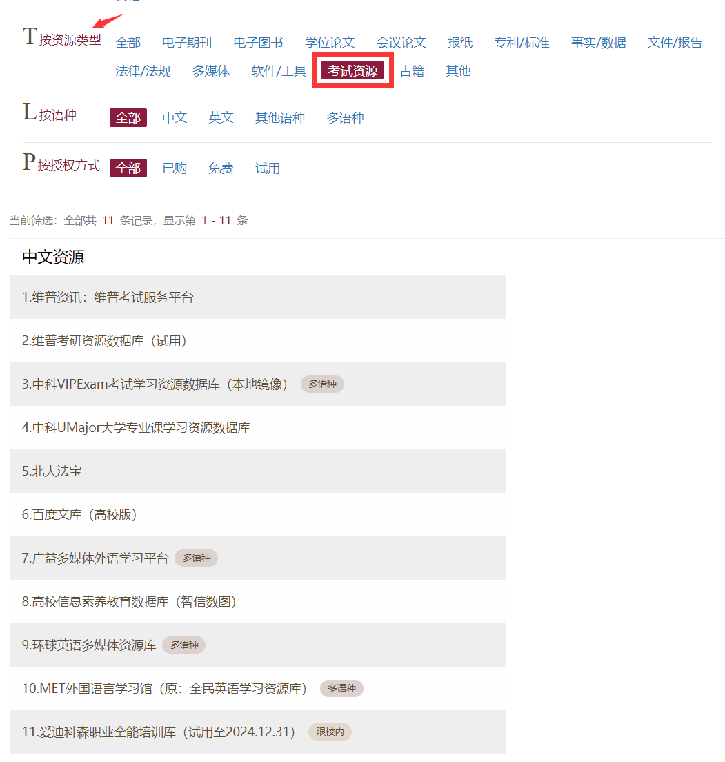 今天,就让我们一起揭开学霸们保持高分的秘密!进入图书馆主页->数据库->数据库导航,在导航页面,按资源类型勾选“考试资源”进行筛选,就能检索到图书馆的考试相关资源,探索图书馆为你精心准备的电子资源宝库。