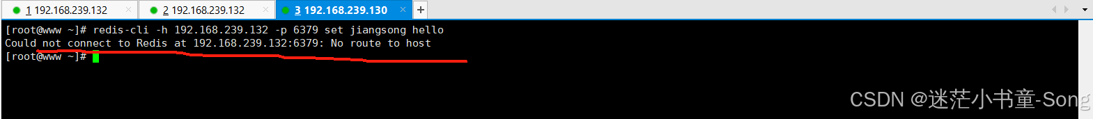 我们可以用redis-cli -h{ip} {host} -p{port} {command}就可以对redis做一次操作,该操作会直接给我们返回相关结果,如我在192.168.239.132服务器上用配置文件的方式开启了一个6379端口的redis服务,那么我就在192.168.239.130服务器上使用redis-cli -h 192.168.239.132 -p 6379 set jiangsong hello,如下图1.1-1 连接报错示意图所示,可以看到的是报错了,我连接不上192.168.239.132这台服务器上的redis,这也是常见错误。