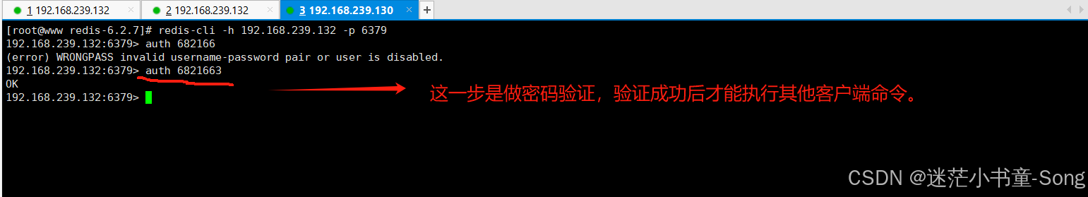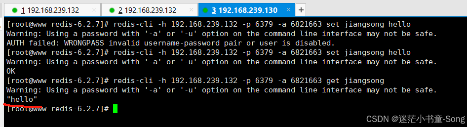 最终,成功在192.168.239.132服务器上运行单次操作:redis-cli -h 192.168.239.132 -p 6379 -a set jiangsong hello,注意-a后面跟的就是上一步在redis.conf下新增的密码,如下图1.1-3 执行单次操作示意图,有warning警告,是因为单次操作加上了密码明文,在redis认为是不安全的,但没关系,本次操作是OK的。我们可以看到,使用redis-cli -h 192.168.239.132 -p 6379 -a get jiangsong也是获得了值hello。