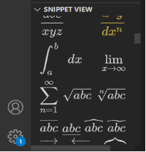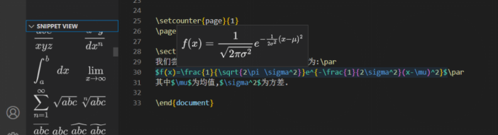 当VScode已经配置好写LaTeX的环境后,在VScode的左下角的snippet view中可以看到常见的数学符号以及各种希腊字母,点击即可在光标处给出该符号或希腊字母的编码。