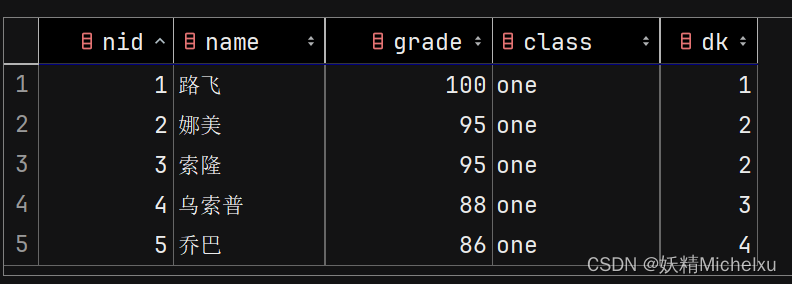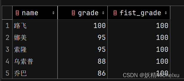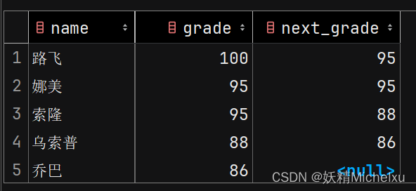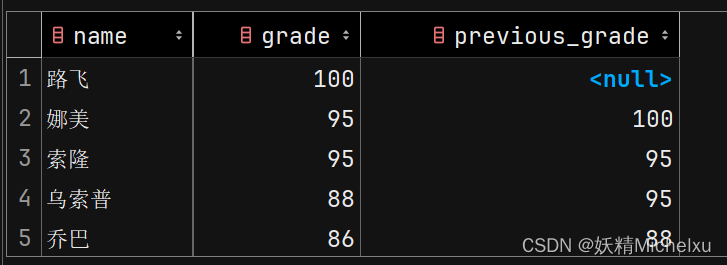 结果为:路飞的前一行成绩没有数据显示null,乔巴的下一行没有成绩数据显示null
