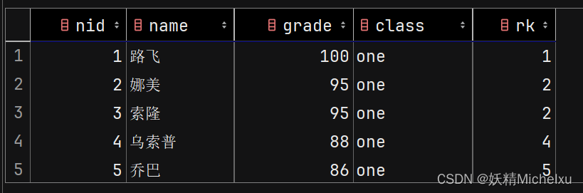(2)rank()排序函数是在有重复的数据情况下会有重复的排名存在,但重复的排名下会跳过当前原有的排序数字,下一个排序的数字在第几就排第几请看下方代码结果: