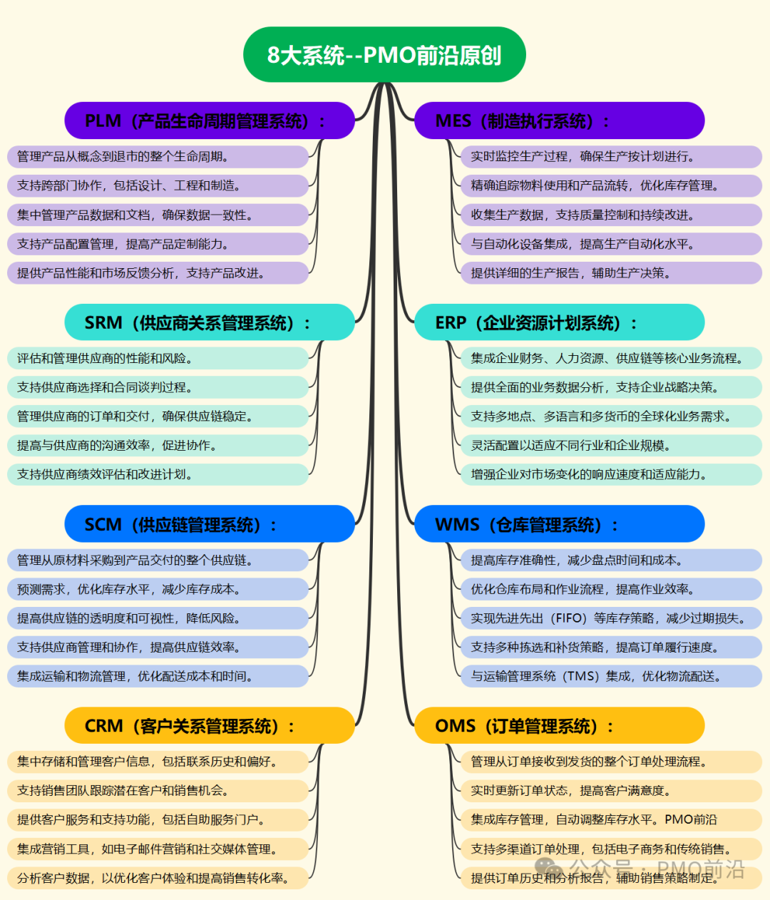 MES、ERP、WMS、OMS、CRM、SCM、SRM、PLM 这些常用的系统,你都知道吗?今天用思维导图全部告诉大家!