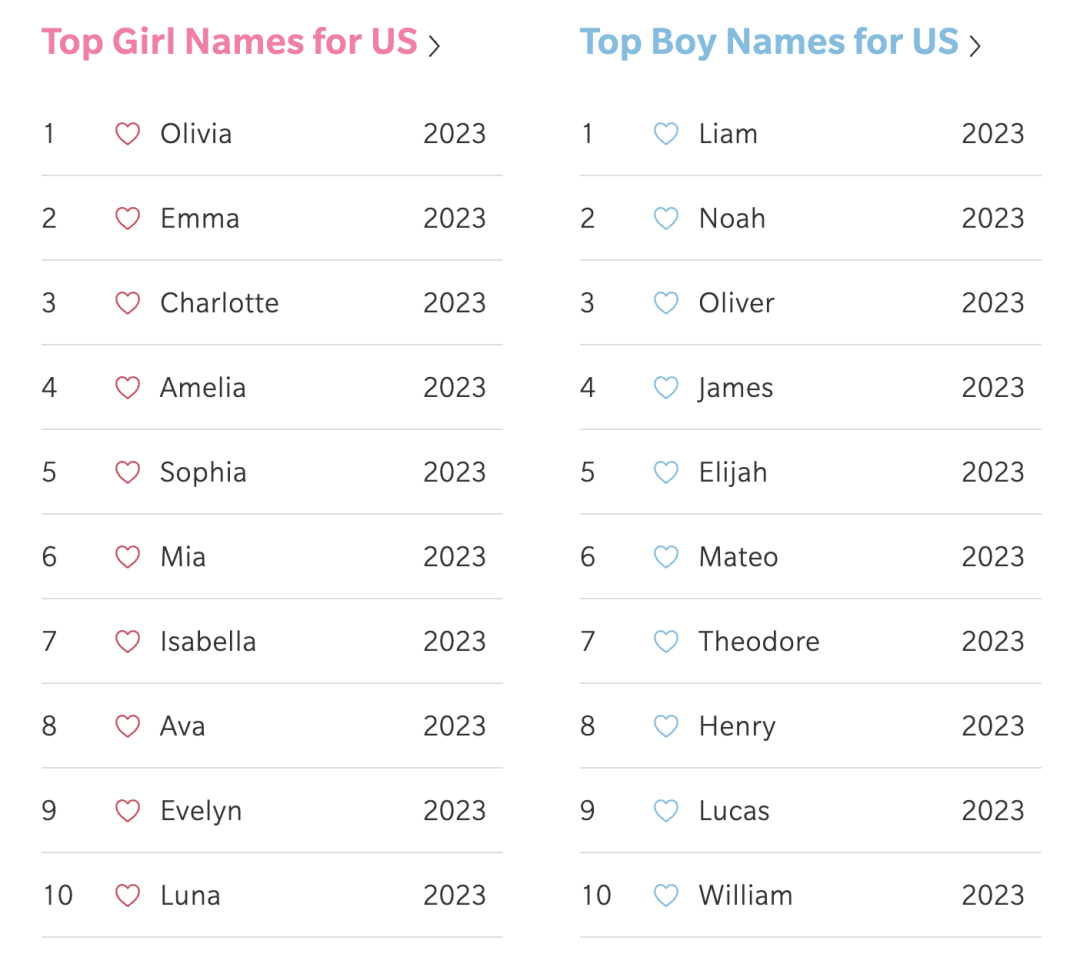 海外某名字网站发布了2024年最受欢迎的新生儿名字,大家也可以参照TOP 10的榜单来起一个自己喜欢的英文名哦