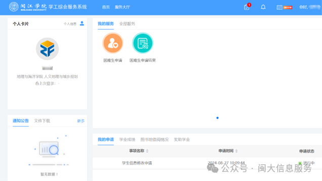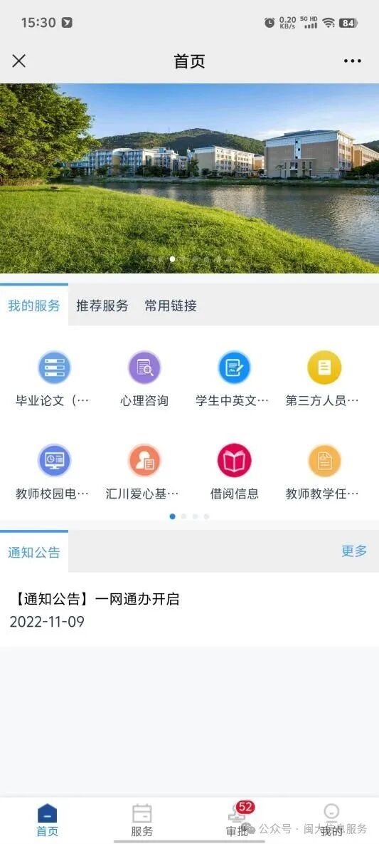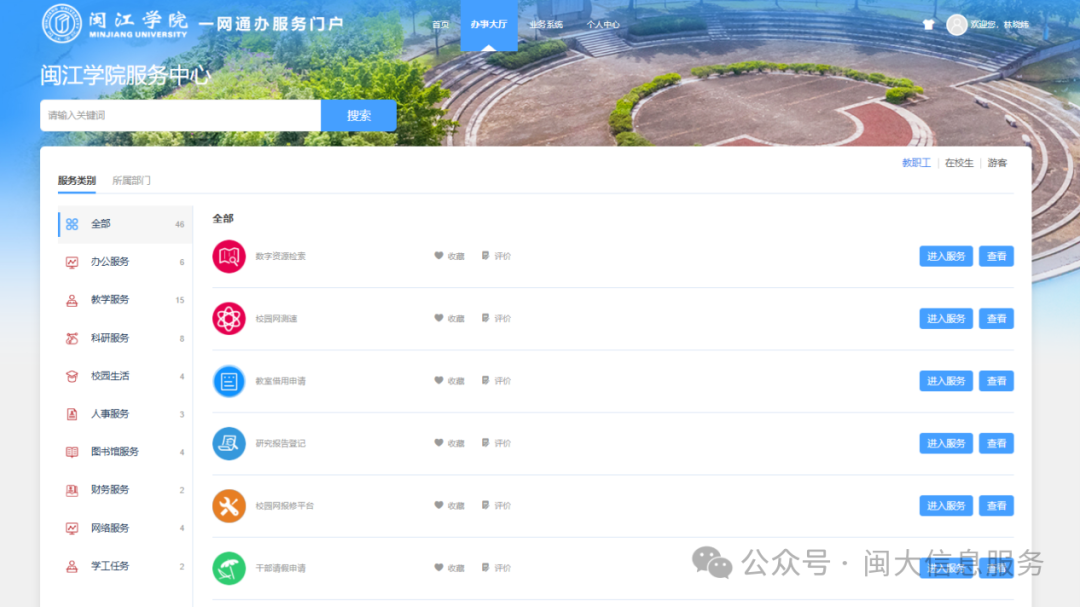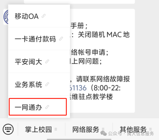 如果您是使用手机/平板,先进入“闽大信息服务”微信公众号,在“掌上校园”菜单栏中选择“一网通办”就可以了。