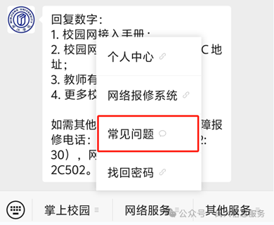 进入“闽大信息服务”微信公众号,在“网络服务”菜单栏中找到“常见问题”可以查询,或通过报修渠道咨询解决。