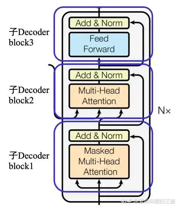 5.2 从结构角度,如图6所示,Transformer Decoder = Embedding + Positional Embedding + N*(子Decoder block1 + 子Decoder block2 + 子Decoder block3)+ Linear + Softmax;