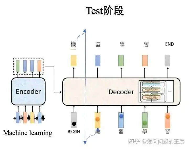 在Train阶段,如图8所示。这时是知道label的,decoder的第一个输入是begin字符,输出第一个向量与label中第一个字符使用cross entropy loss。Decoder的第二个输入是第一个向量的label,Decoder的第N个输入对应的输出是End字符,到此结束。这里也可以看到,在Train阶段是可以进行并行训练的。