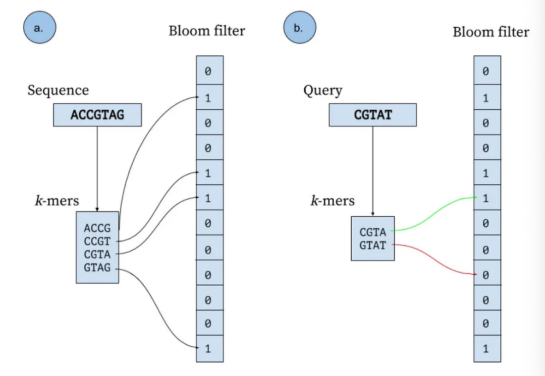 • Hash k-mers,每个k-mers通过一些hash函数,这些hash 函数,接收k-mers,映射到bit array中的特定位置 /o:p