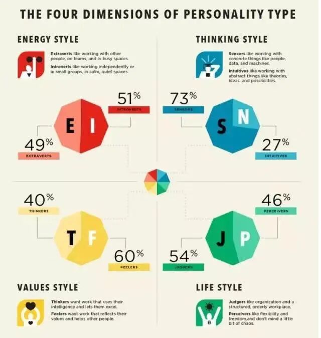 其认为这四个维度就是四把标尺,每个人的性格都会落在标尺的某个点上,这个点靠近哪个端点,就意味着这个人就有哪方面的偏好,也进而形成了16种不同的人格。