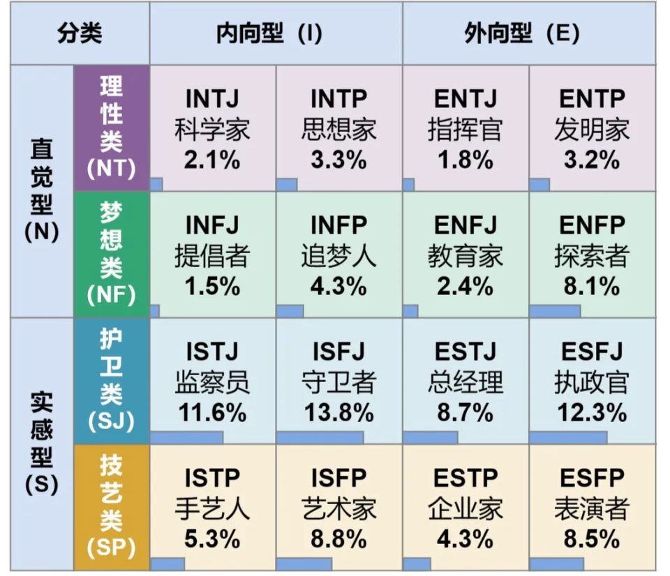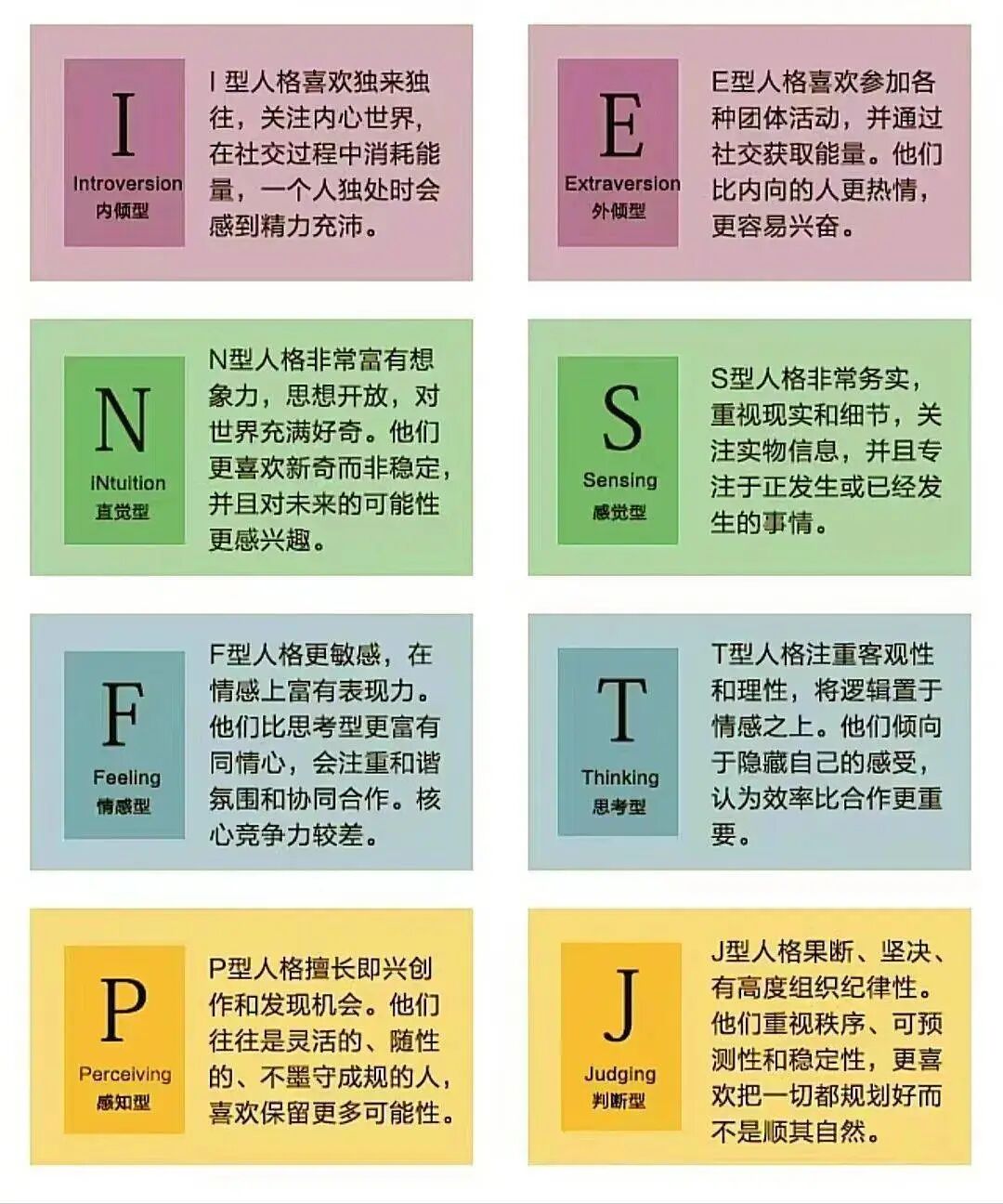近来,在诸多的自我介绍中,我们总是听到“我是E人”“我是I人”“ENFP”等诸多表述,这些表述简单明了而又诙谐有趣,深受我们00后的喜欢,其实,这一表述是源于MBTI的人格测试,即为迈尔斯-布里格斯类型指标,其不仅仅分为“E”和“I”,而是分为四个维度。