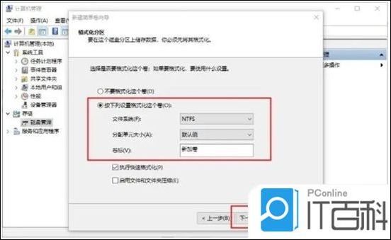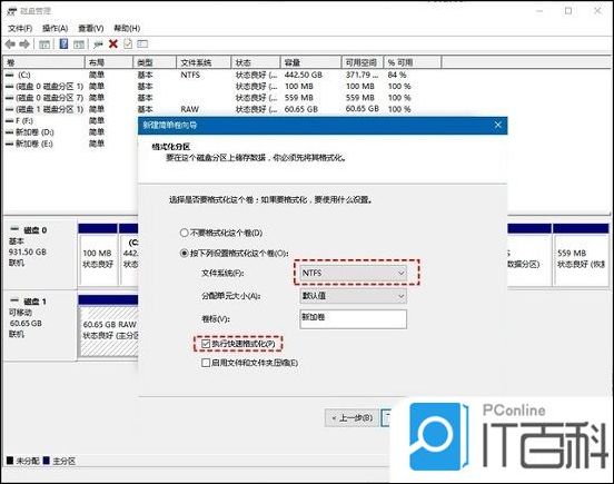 3、 选择正确的文件系统,分配单元大小选择“ 默认 ”。然后按“ 确定 ”按钮。