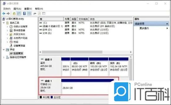 4、 点击“ 磁盘管理 ”打开,确认好u盘的盘号。(如图所示是1盘)