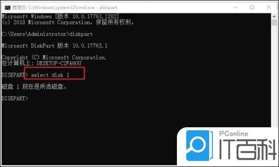 5、 然后在命令提示符窗口中输入DISKPART>右侧,继续输入命令“ select disk 1 ”敲回车(刚才查看的盘号是几,我们就在select disk 后面输几,比如这里是1。)