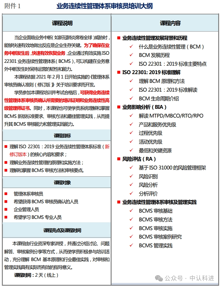 附件:1、《业务连续性管理体系审核员培训》课程大纲