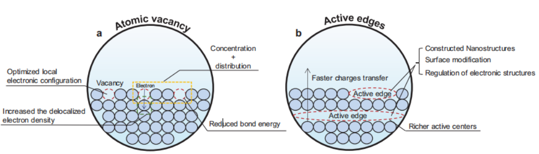 图5.提高催化性能的空位策略的示意图。空位缺陷提高了活性位点的利用,同时也提高了电导率,其中空位策略包括a)原子空位和b)活性边缘的暴露。