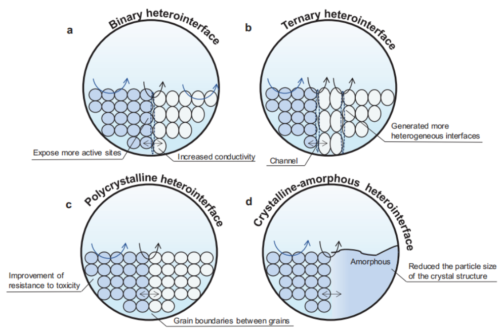图8. 四种不同的非均质界面结构的作用示意图,包括a)二元异质界面结构,b)三元非均构结构,c)多晶异质界面结构和d)晶体-非晶异质界面结构。