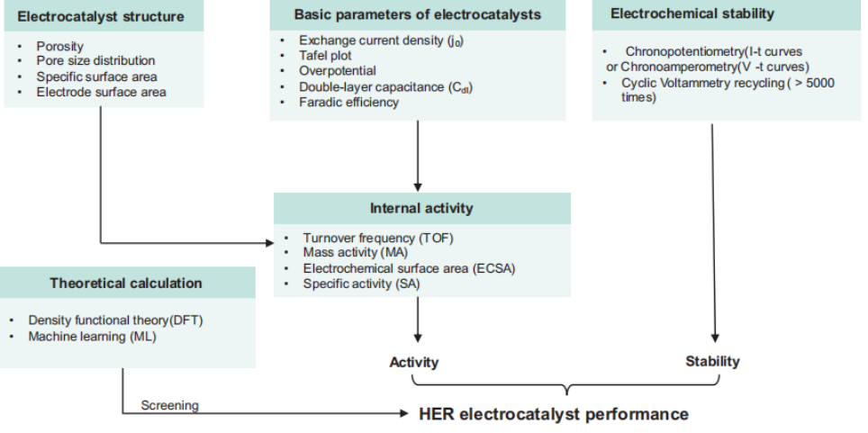 图3说明HER催化剂的基本指标、材料属性/属性和性能的相关性。使用理论计算可以帮助确定适合用作HER催化剂的材料。从电化学测试和物理表征中获得的数据为评估这些材料表现出优异的HER催化潜力提供有力证明。