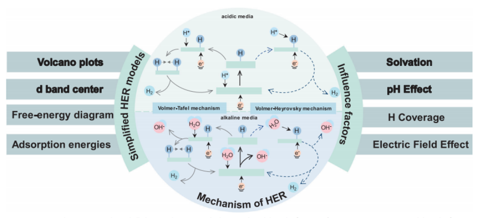图2. 在酸性和碱性条件下,HER的反应机理和影响因素
