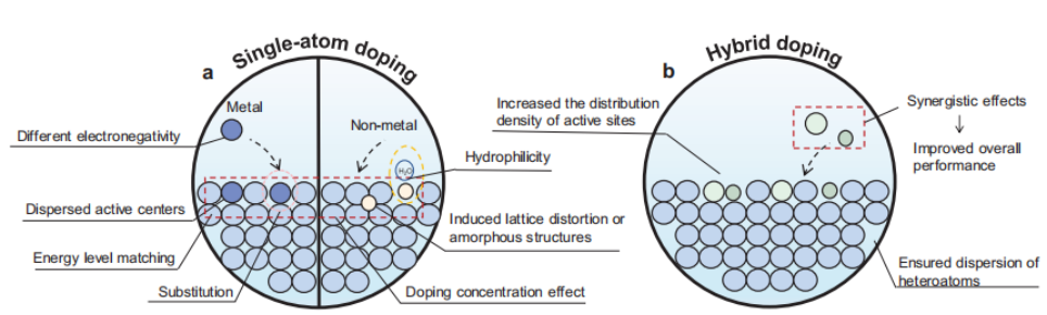 图4.提高催化性能的掺杂策略的示意图。利用不同掺杂原子的独特性质对催化剂进行修饰,以提高其性能,其中包括a)单原子掺杂和b)杂化掺杂。
