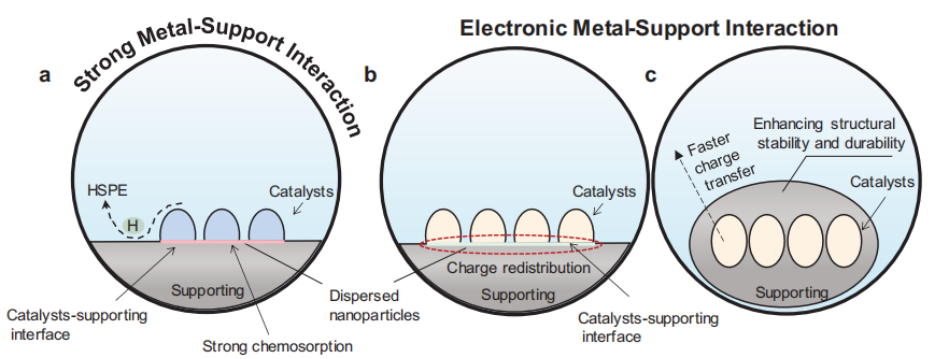 图9.金属-载体相互作用的示意图。载体可以促进催化纳米颗粒的分散,并提高电导率。有两种主要形式:a)强金属支撑载体相互作用和电子金属载体相互作用,其中电子金属支撑相互作用有b)基底和c)包覆两种结构。