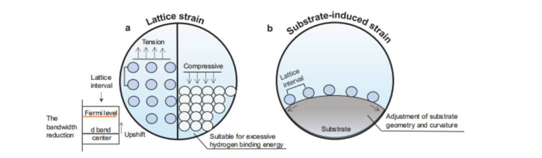 图7. 应变工程对催化反应的影响示意图。a)晶格应变产生的影响,其中包括拉伸应力和压缩应力。b)由基底诱导产生的应变工程。