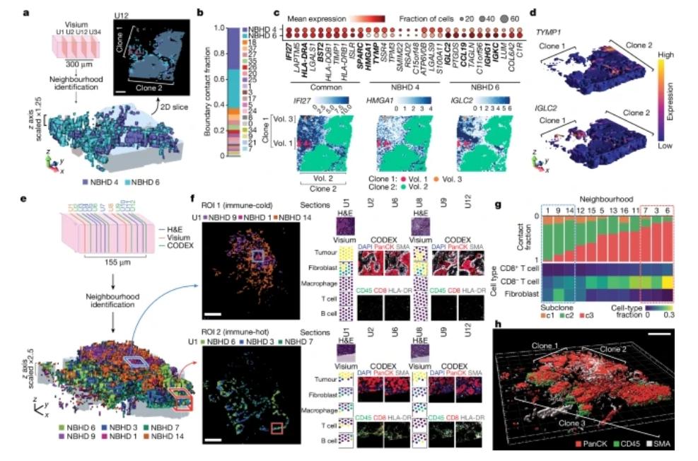 2024年10月30日,美国华盛顿大学医学院丁莉团队在期刊《Nature》上发表了题为“Tumour evolution and microenvironment interactions in 2D and 3D space”的研究论文。团队通过共同注册来自16个样本的48个连续ST切片来重建3D肿瘤结构,这提供了对肿瘤空间组织和异质性的见解。此外,使用无监督深度学习算法并整合ST和CODEX数据,团队确定了3D亚克隆周围的免疫热邻域和冷邻域,并增强了免疫耗竭标志物。这些发现通过与2D和3D空间中局部微环境的相互作用,有助于理解空间肿瘤进化,为肿瘤生物学提供有价值的见解。
