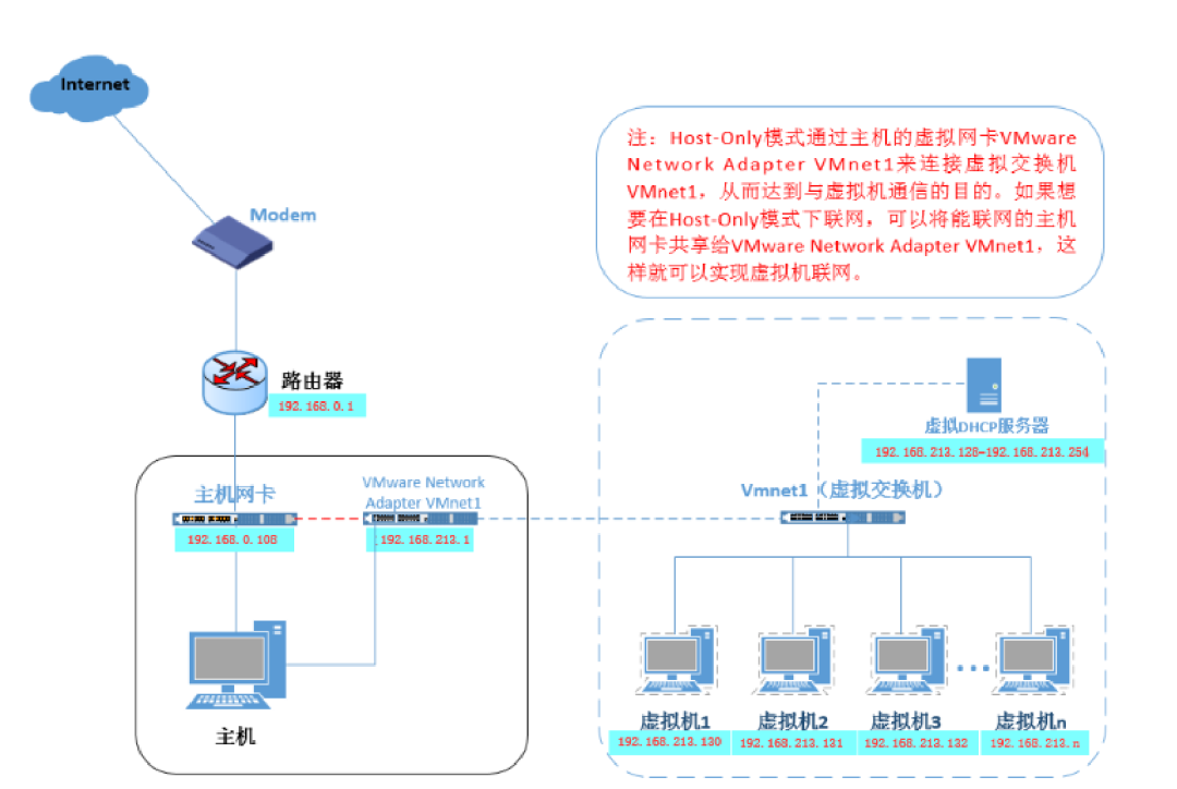 Host-Only模式其实就是NAT模式去除了虚拟NAT设备,然后使用VMware Network Adapter VMnet1虚拟网卡连接VMnet1虚拟交换机来与虚拟机通信的,Host-Only模式将虚拟机与外网隔开,使得虚拟机成为一个独立的系统,只与主机相互通讯。