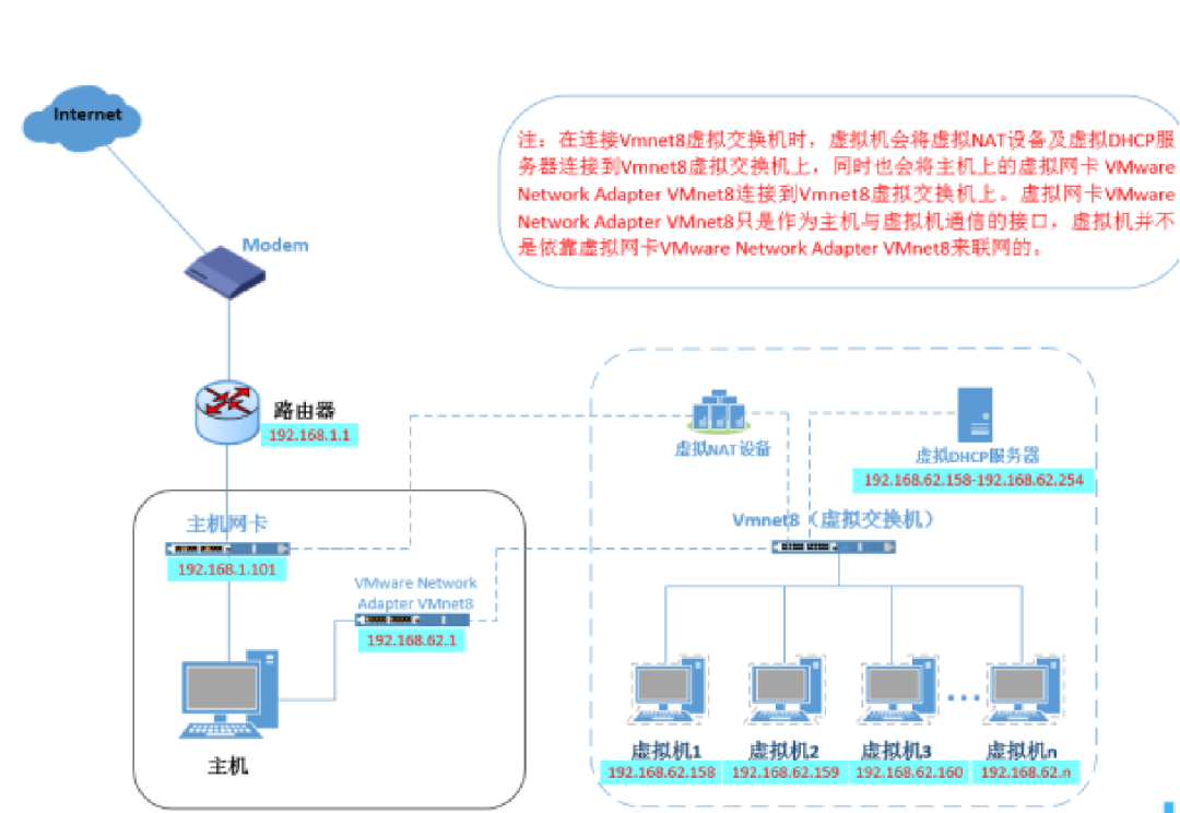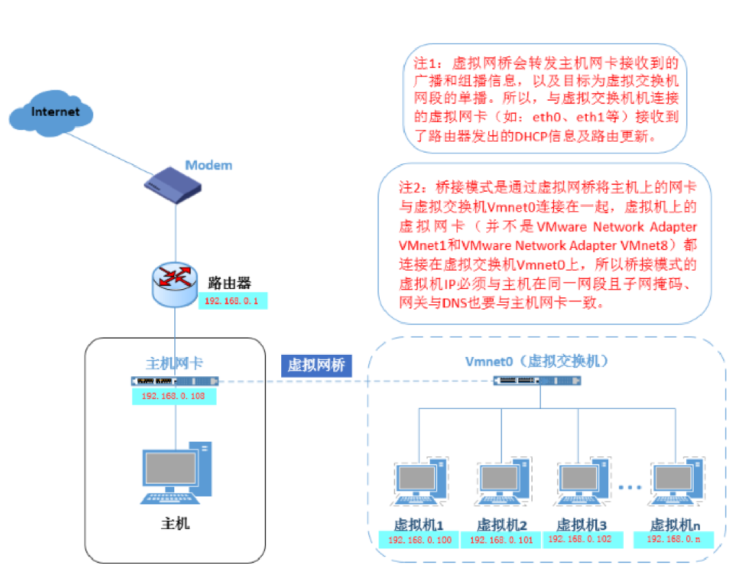 桥接模式就是将主机网卡与虚拟机的网卡利用虚拟网桥进行通信。在桥接的作用下,类似于把物理主机虚拟为一个交换机,所有桥接设置的虚拟机连接到这个交换机的一个接口上,物理主机也同样插在这个交换机当中,所以所有桥接下的网卡与网卡都是交换模式的,相互可以访问而不干扰。