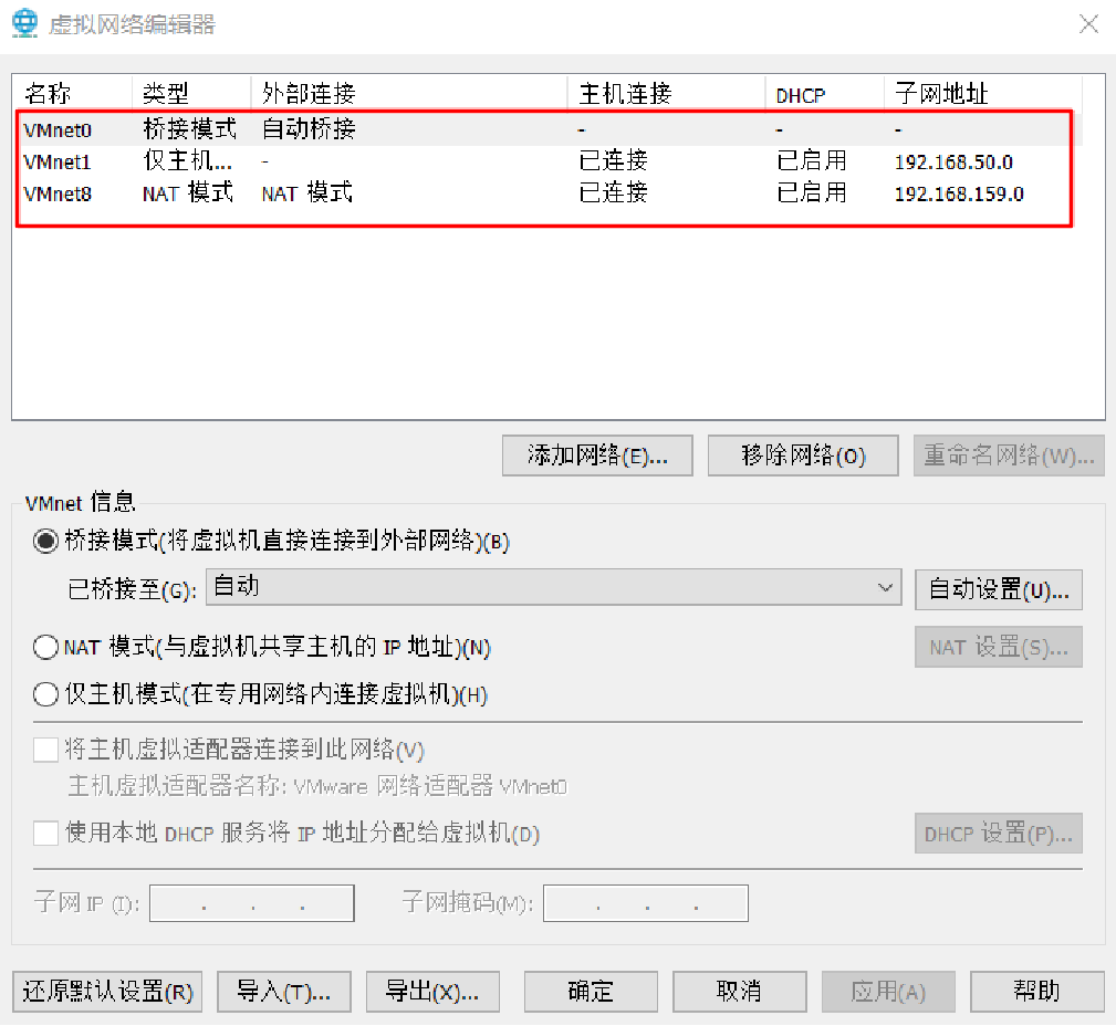 基础介绍vmware为我们提供了三种网络工作模式,它们分别是:Bridged(桥接模式)、NAT(网络地址转换模式)、Host-Only(仅主机模式)。打开vmware虚拟机,我们可以在选项栏的“编辑”下的“虚拟网络编辑器”中看到VMnet0(桥接模式)、VMnet1(仅主机模式)、VMnet8(NAT模式)。那么这些都是有什么作用呢?VMnet0表示的是用于桥接模式下的虚拟交换机;VMnet1表示的是用于仅主机模式下的虚拟交换机;VMnet8表示的是用于NAT模式下的虚拟交换机。