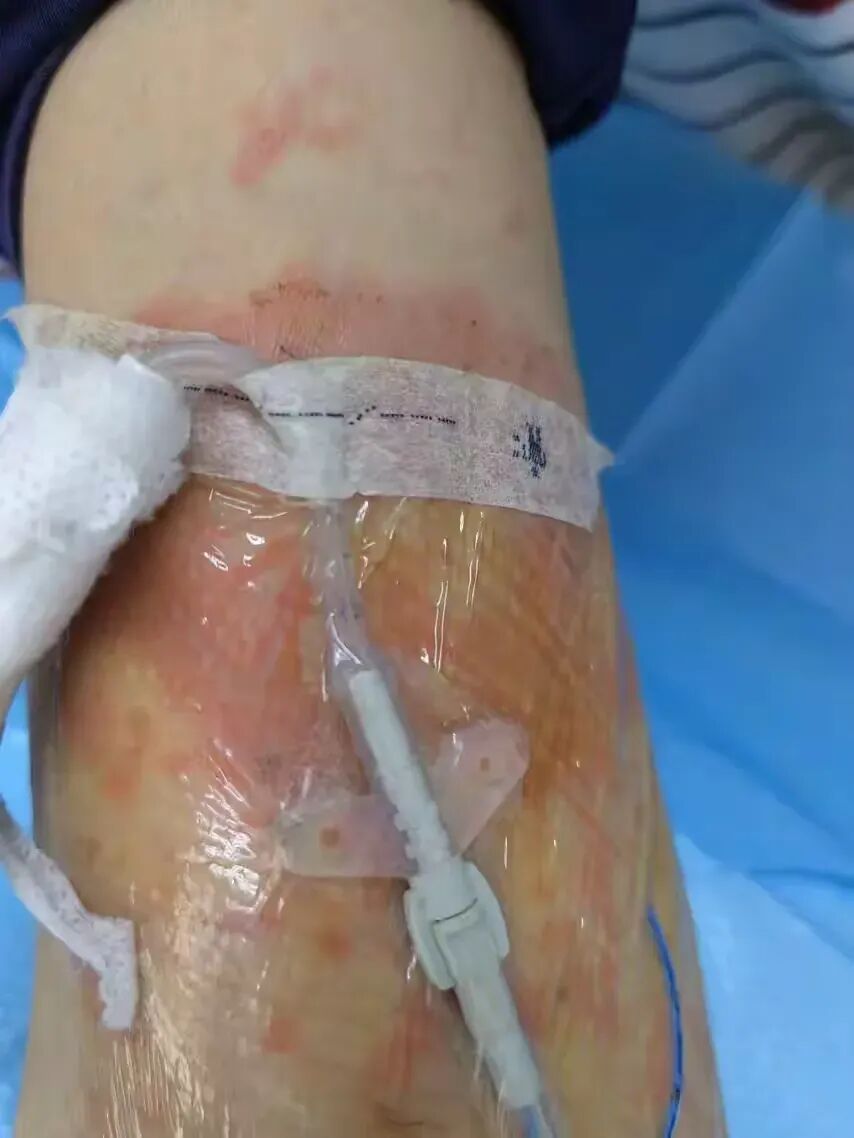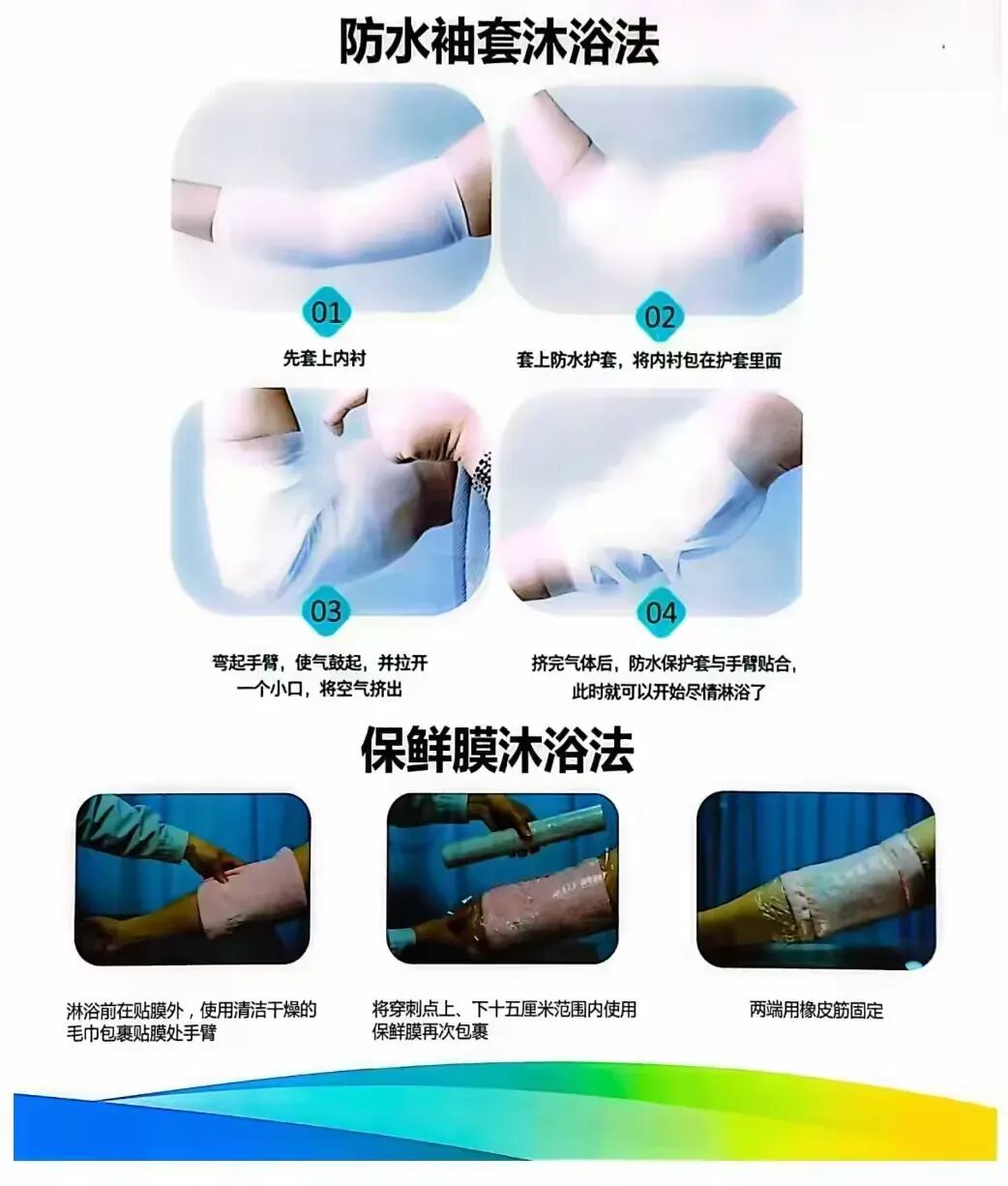 三、沐浴选择淋浴,避免盆浴,可用保鲜膜防水保护套包裹PICC处,沐浴结束观察贴膜处有无浸湿。