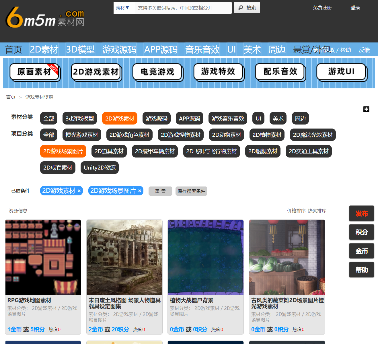 6m5m素材网对于小编这种游戏制**好者,非专业人员来说还是比较实用的,小编也去该网站下载了几个资源,但是分类不够细致,没有找到小编想要的类型~ 不过下载的资源质量还是很高,该网站吸引小编的地方是资源丰富、质量较高。当然该网站也有几个不足之处:网站大部分资源需要积分或者金币获取,而积分或者金币除了充值会员之外还可以上传作品获得,网站会收取服务成本