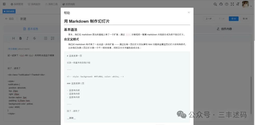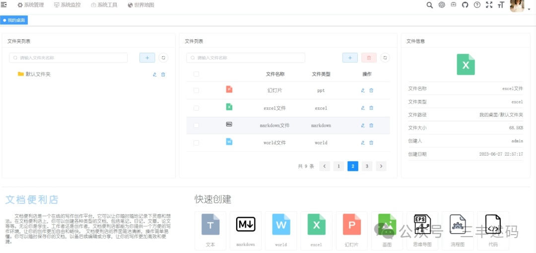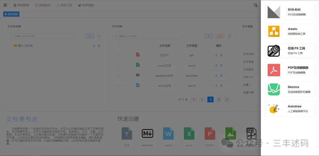 - 文档便利店:支持world、excel、markdown、画图、思维导图、流程图等多种文档类型,支持基于 Markdown 的幻灯片制作、在线代码编写。