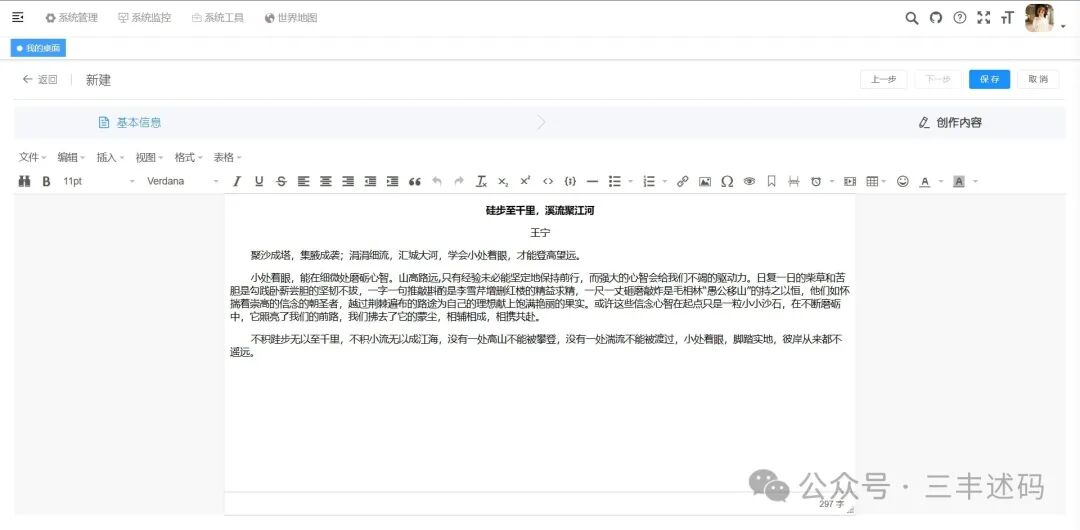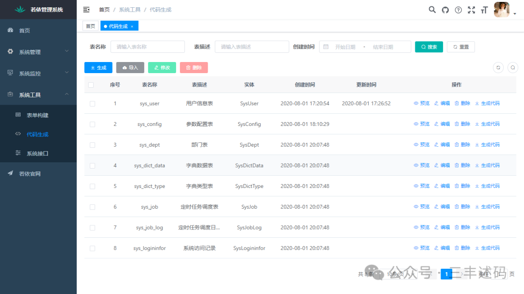 * 代码生成器:集成了代码生成器,可以根据数据库表结构快速生成相应的后端代码(Java、Spring Boot)和前端页面(Vue.js),大大提高了开发效率。