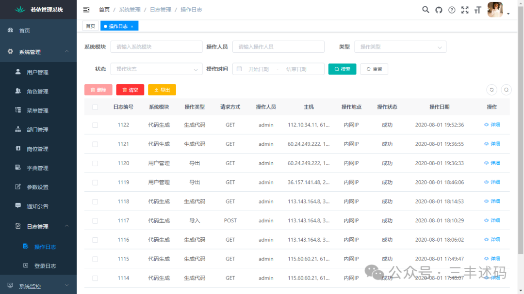 - 操作日志:系统正常操作日志记录和查询;系统异常信息日志记录和查询。