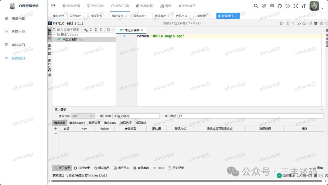 - 集成 Magic-Api: 在浏览器中就可以 编写接口,省去Controller、Service、DAO等繁琐代码,保存即发布,极大得提高了开发效率。