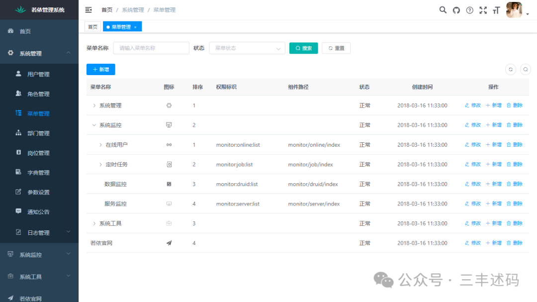 - 菜单管理:配置系统菜单,操作权限,按钮权限标识等。